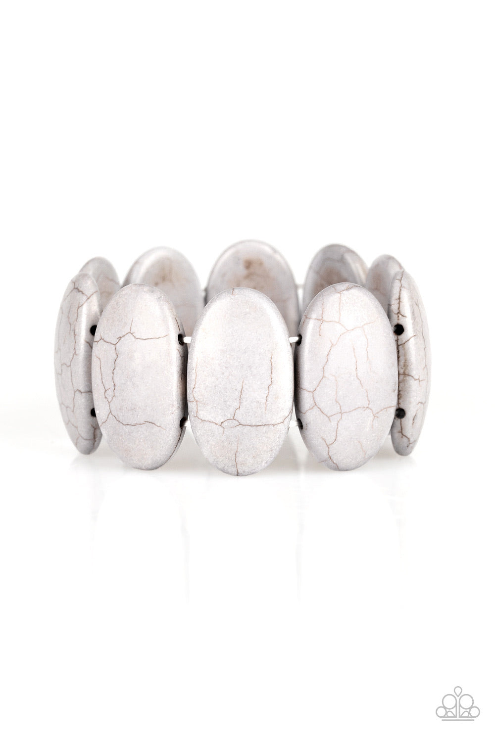 Chiseled into smooth ovals, earthy gray stones are threaded along stretchy elastic bands around the wrist for an artisan inspired look.