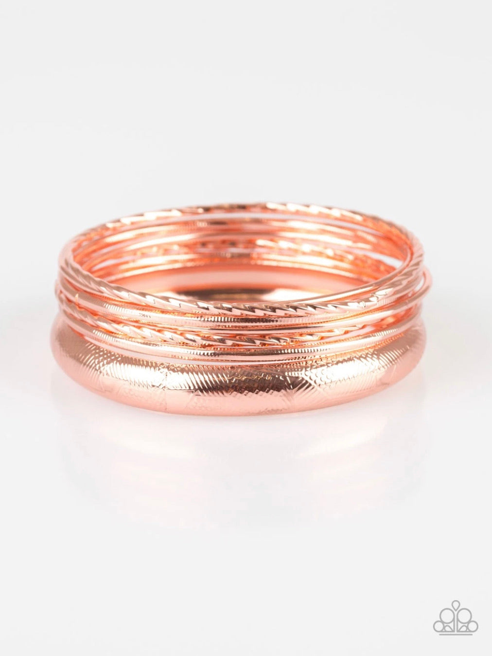 Featuring smooth and textured finishes, a collection of mismatched shiny copper bangles stack across the wrist for a classic look.