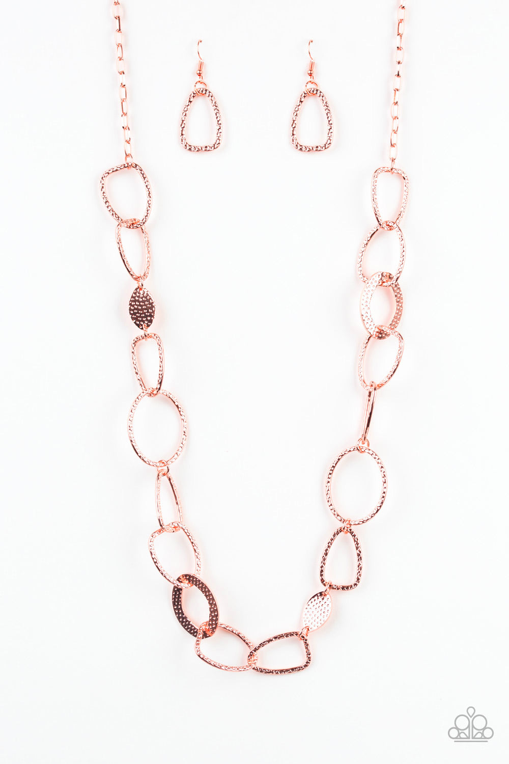 Delicately hammered in shimmery textures, asymmetrical shiny copper frames and hoops connect into an edgy chain across the chest. Features an adjustable clasp closure.