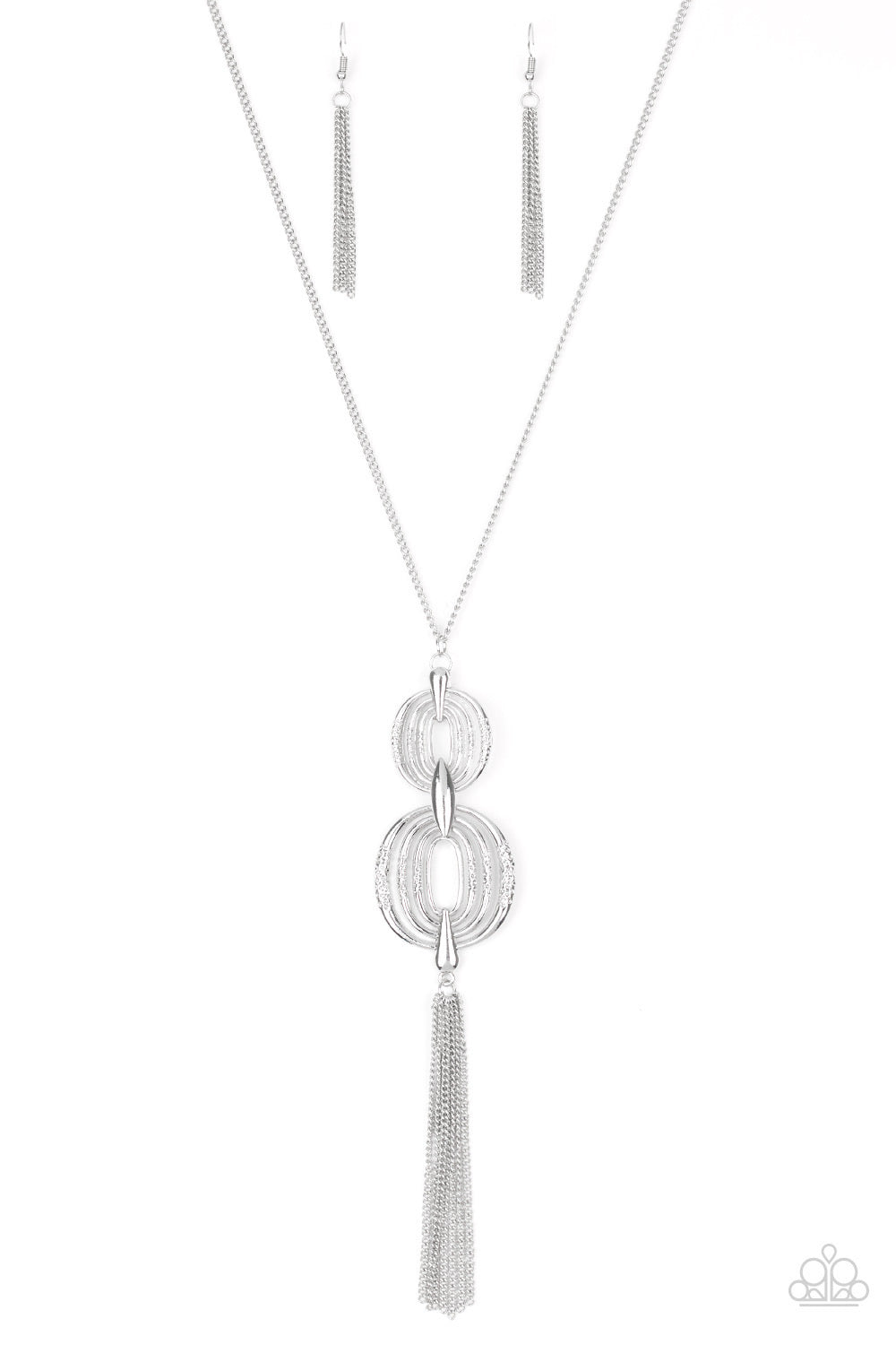 Delicately hammered in sections of shimmer, silver circular frames stack into a bold pendant at the bottom of a lengthened silver chain. A shimmery silver tassel swings from the bottom of the stacked pendant for a casual finish. Features an adjustable clasp closure.