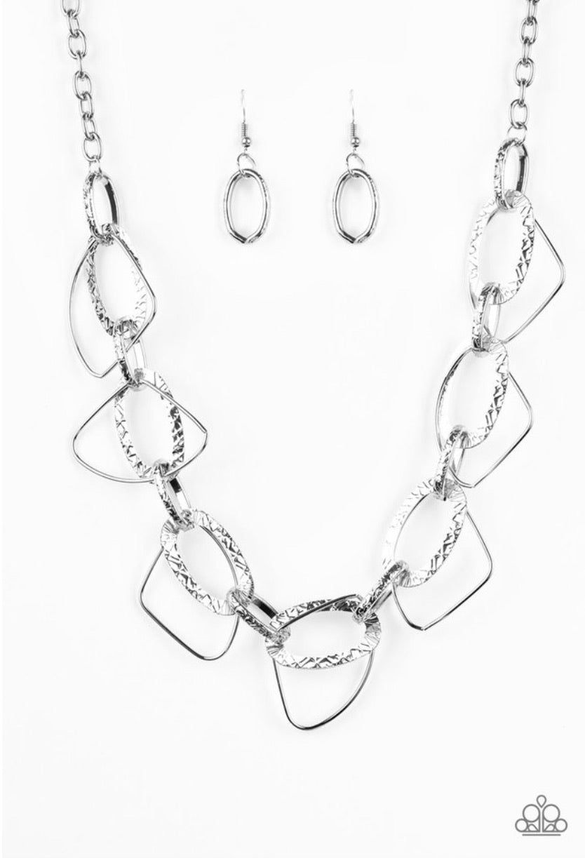 Embossed in glistening patterns, a collection of textured silver hoops connect with asymmetrical silver frames below the collar for an edgy industrial look. Features an adjustable clasp closure.
