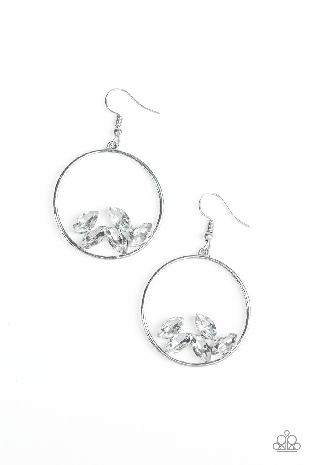 Glittery white marquise-cut rhinestones collect at the bottom of an airy silver hoop for a glamorous look. Earring attaches to a standard fishhook fitting.