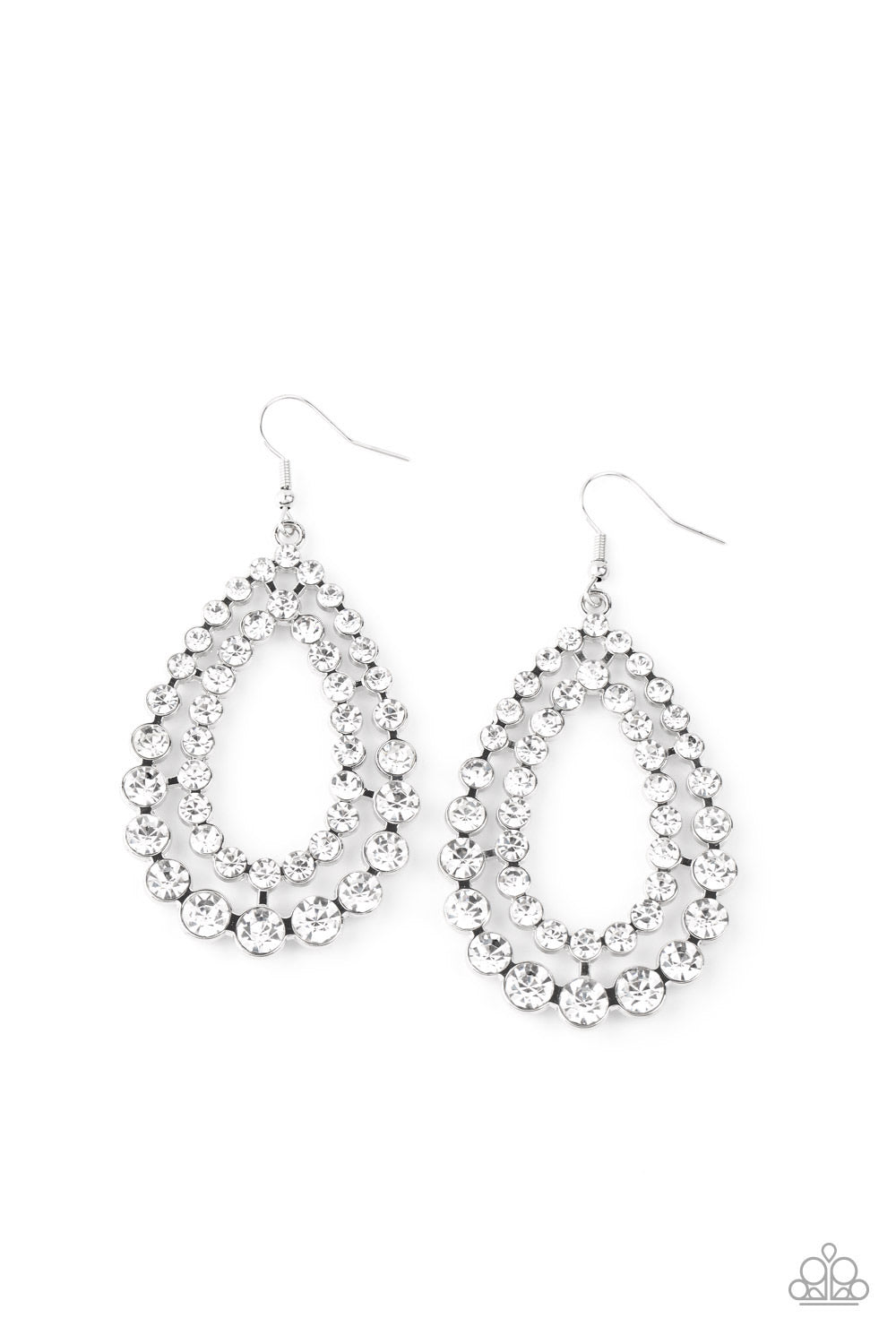 Varying in size, rows of glittery white rhinestones coalesce into two blinding teardrops for a jaw-dropping dazzle. Earring attaches to a standard fishhook fitting.
